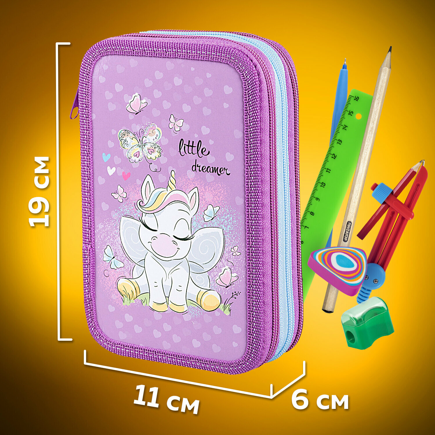 Пенал имеет стандартный размер 19х11 см, что позволяет легко размещать его в ранце или рюкзаке, сумке. Хорошая наполняемость пенала дает возможность держать под рукой все необходимые для уроков канцтовары.