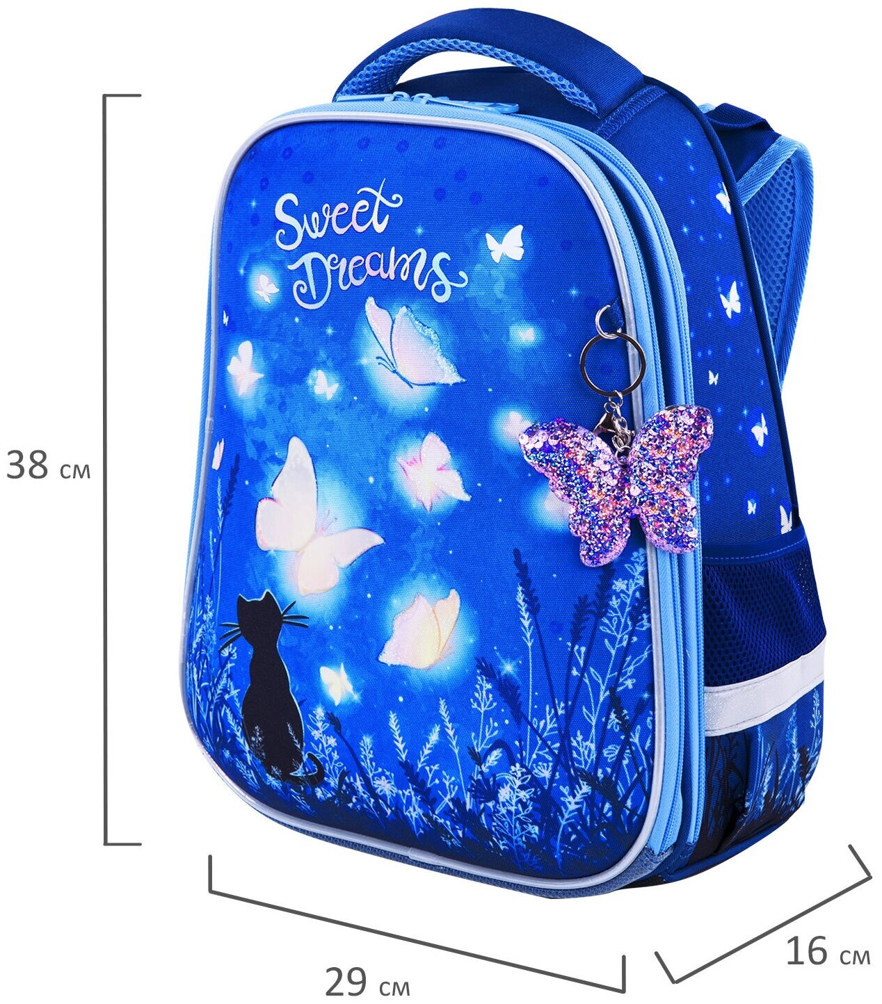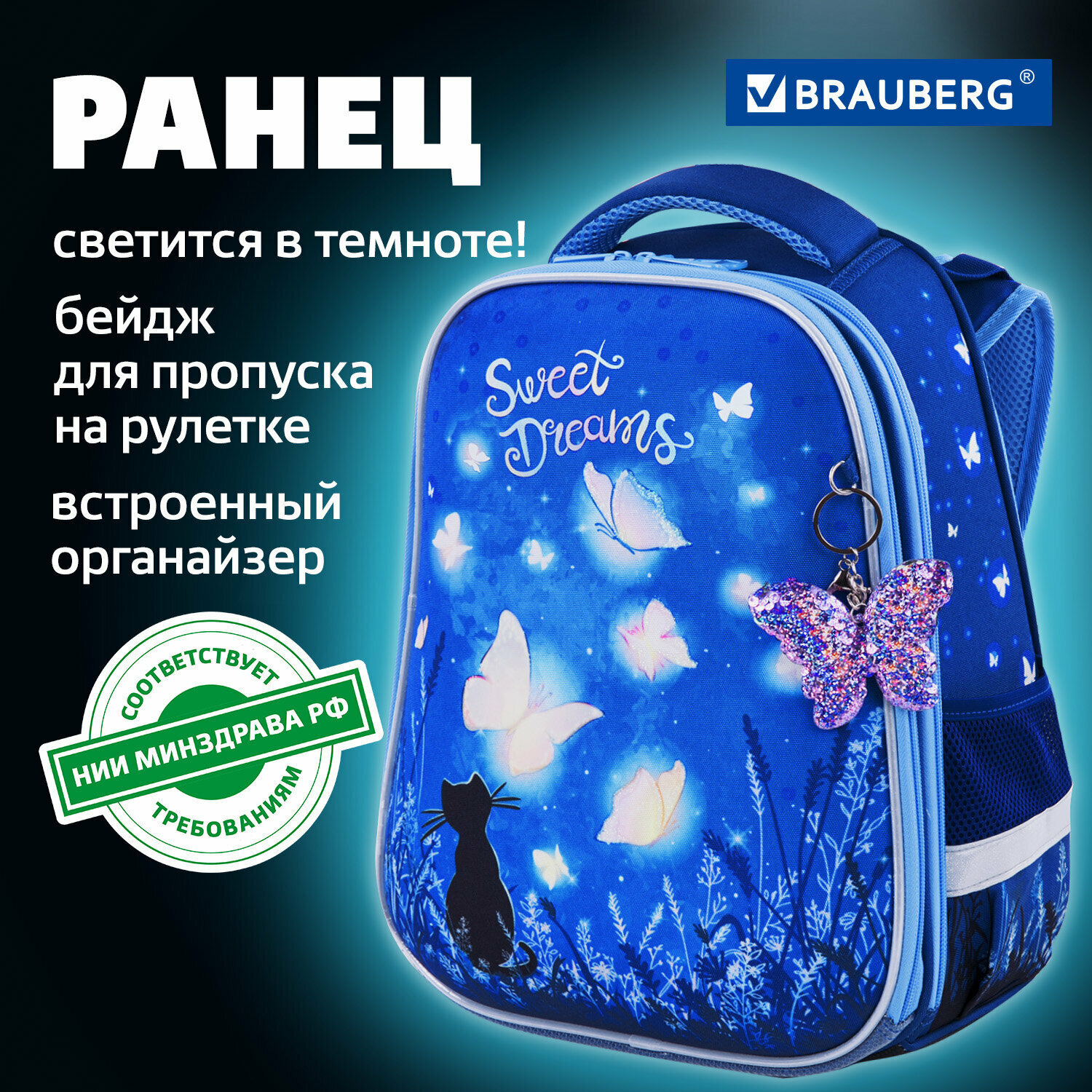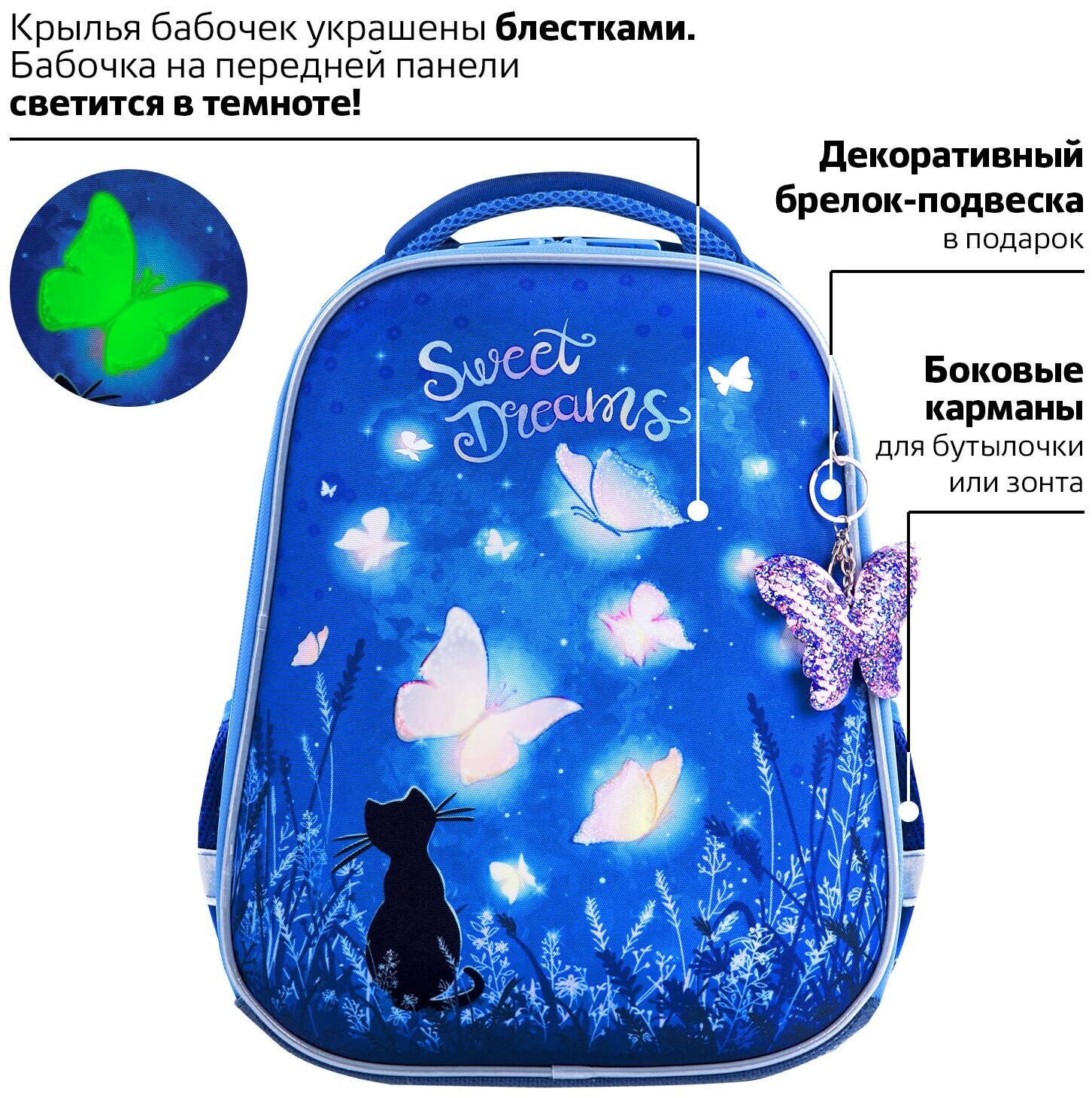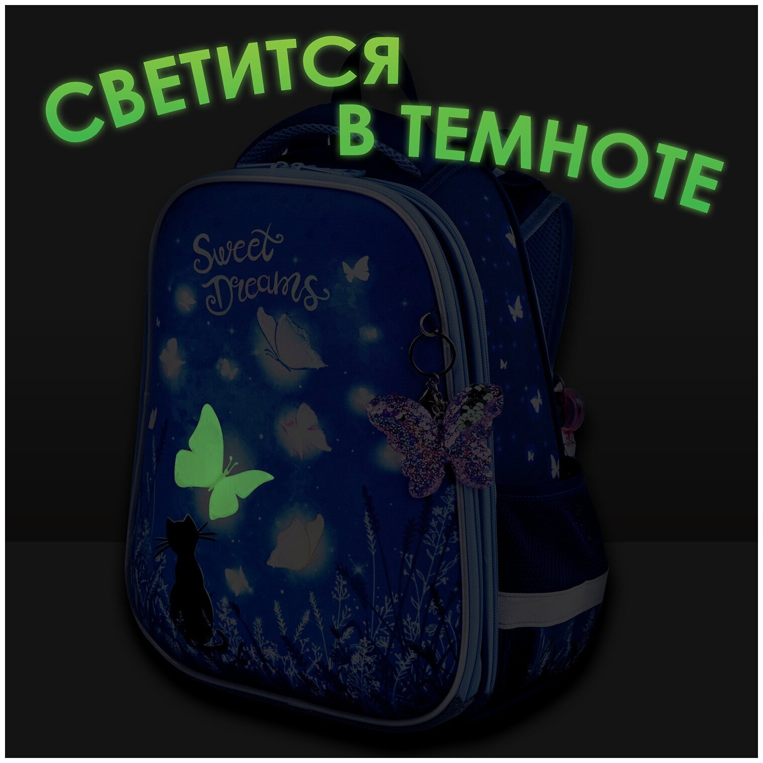 Крылья бабочек на передней панели ранца украшены переливающимися блестками! Светящийся эффект бабочки реализован с помощью современной и технологичной печати на ткани специальной краской. Эффект свечения достигается за счёт накопления дневного или искусственного света.