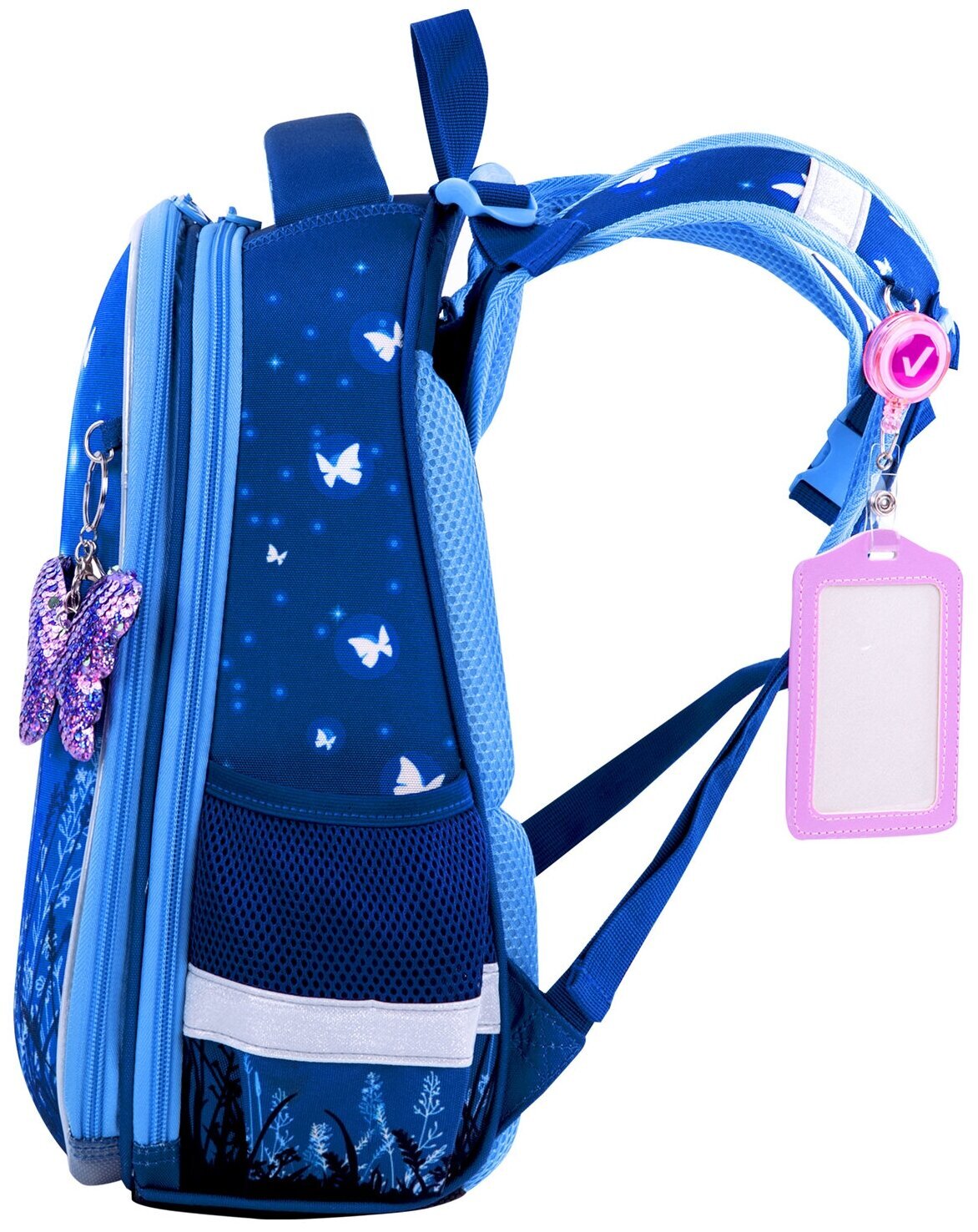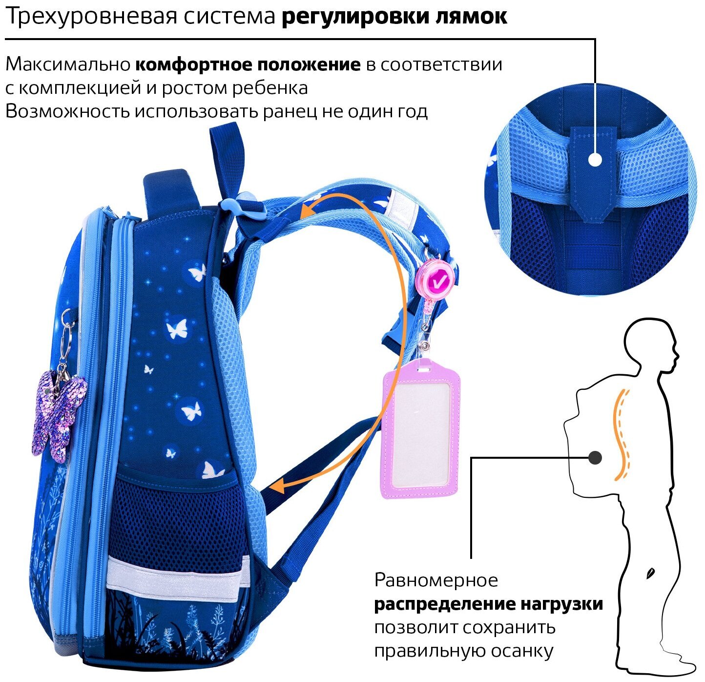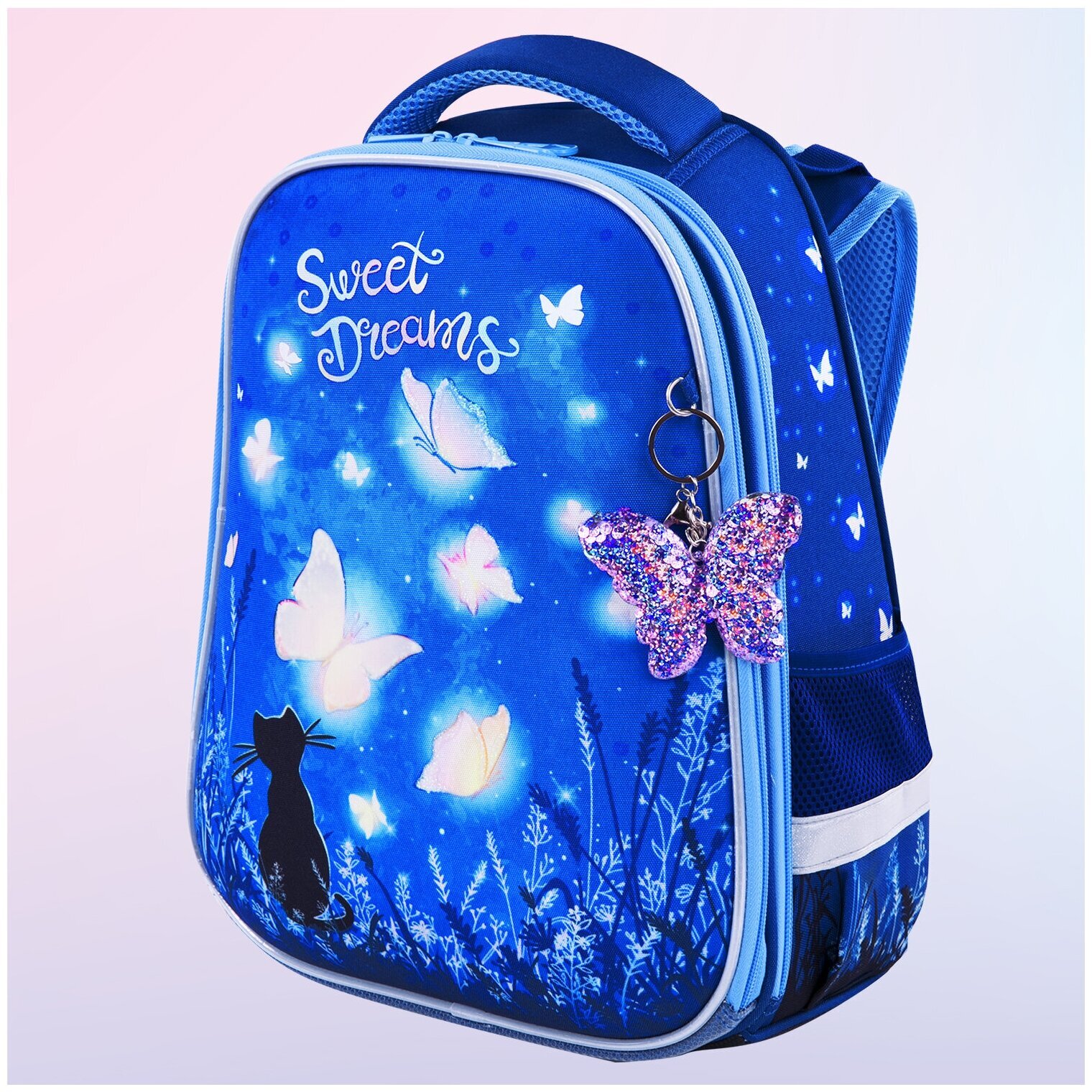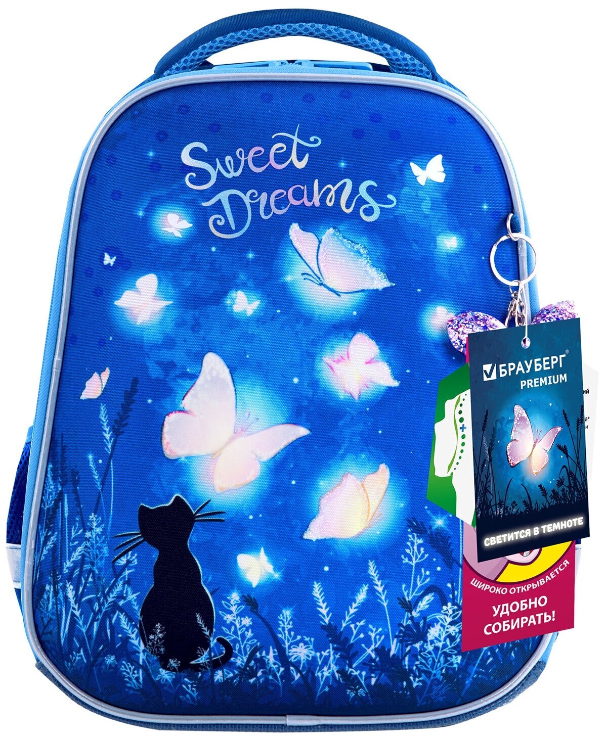 Крылья бабочек на передней панели ранца украшены переливающимися блестками! Светящийся эффект бабочки реализован с помощью современной и технологичной печати на ткани специальной краской. Эффект свечения достигается за счёт накопления дневного или искусственного света.