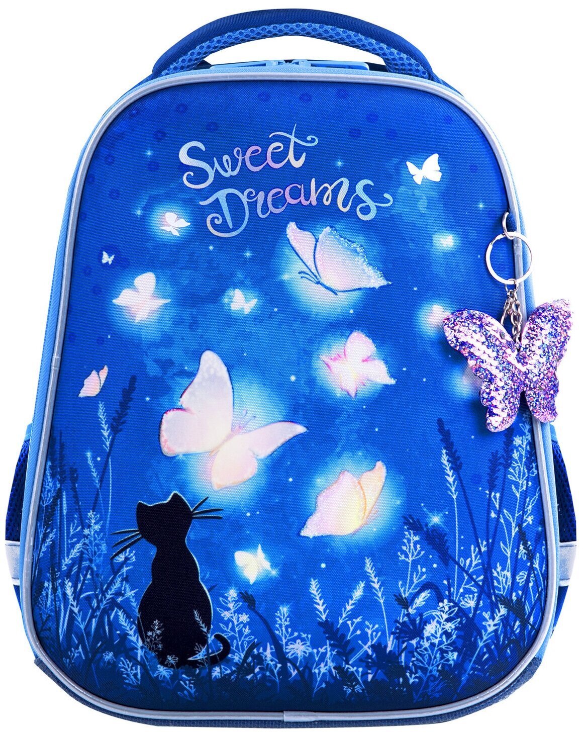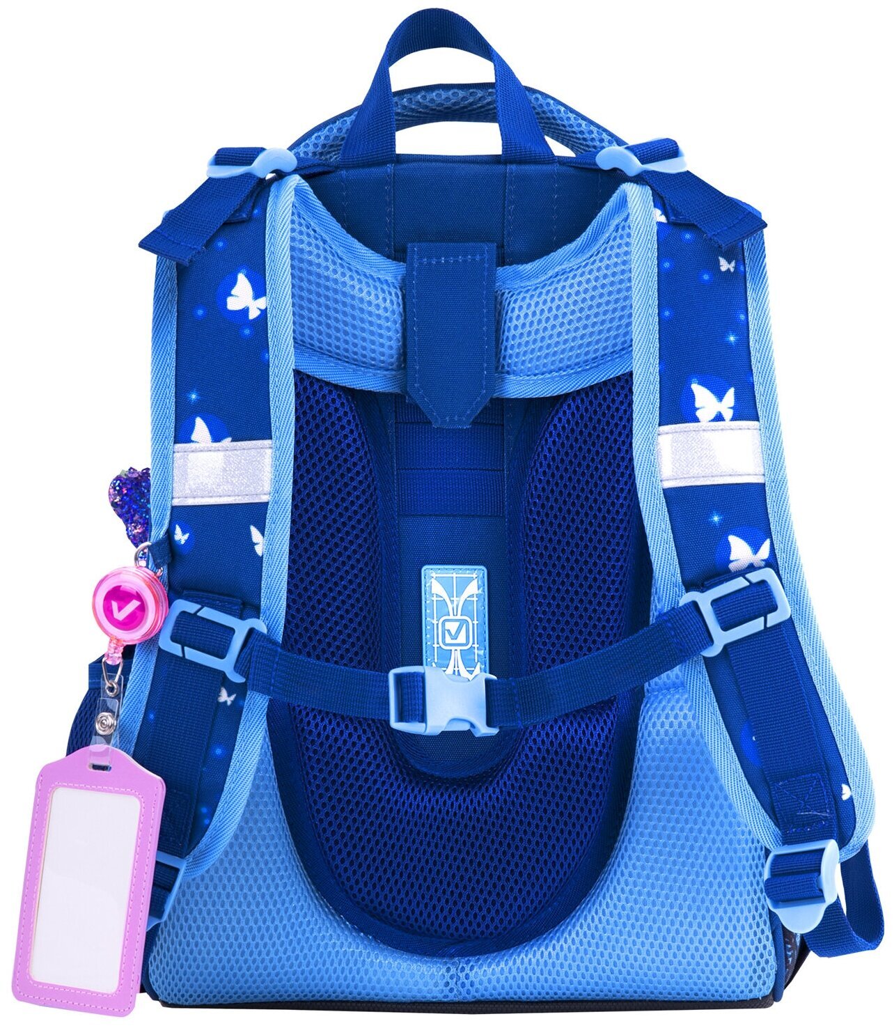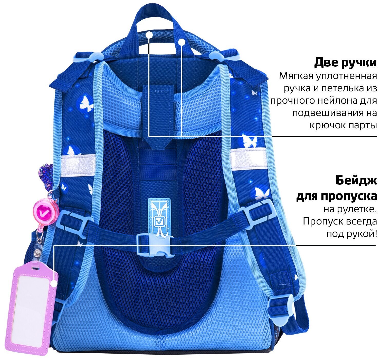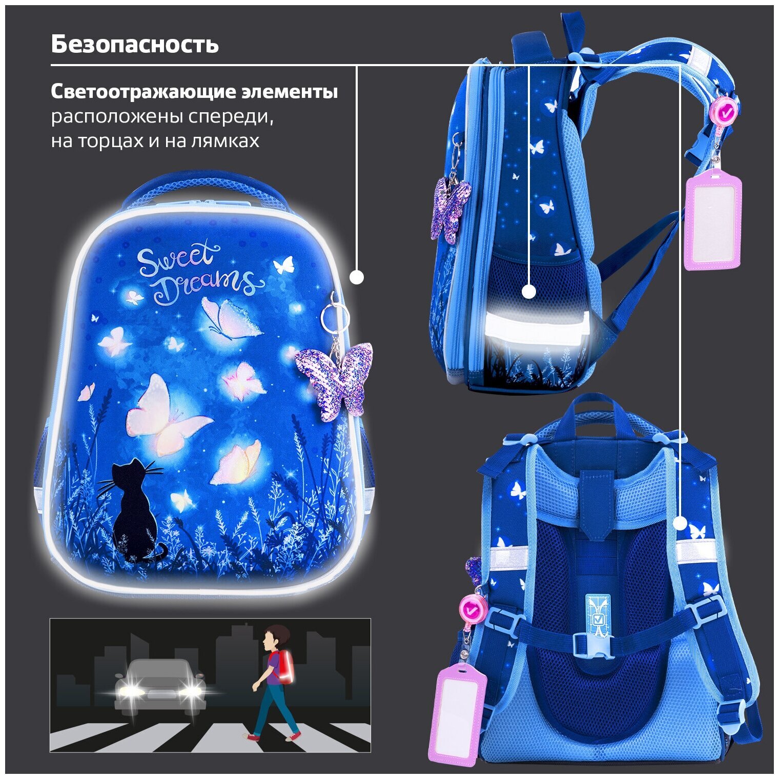 Крылья бабочек на передней панели ранца украшены переливающимися блестками! Светящийся эффект бабочки реализован с помощью современной и технологичной печати на ткани специальной краской. Эффект свечения достигается за счёт накопления дневного или искусственного света.