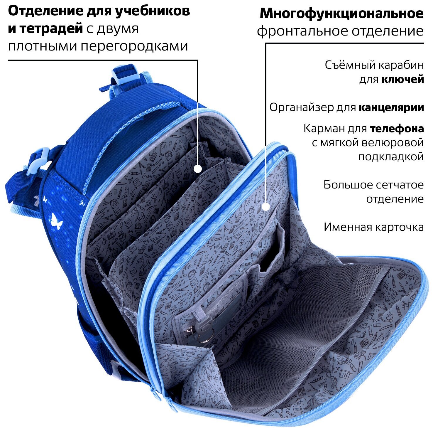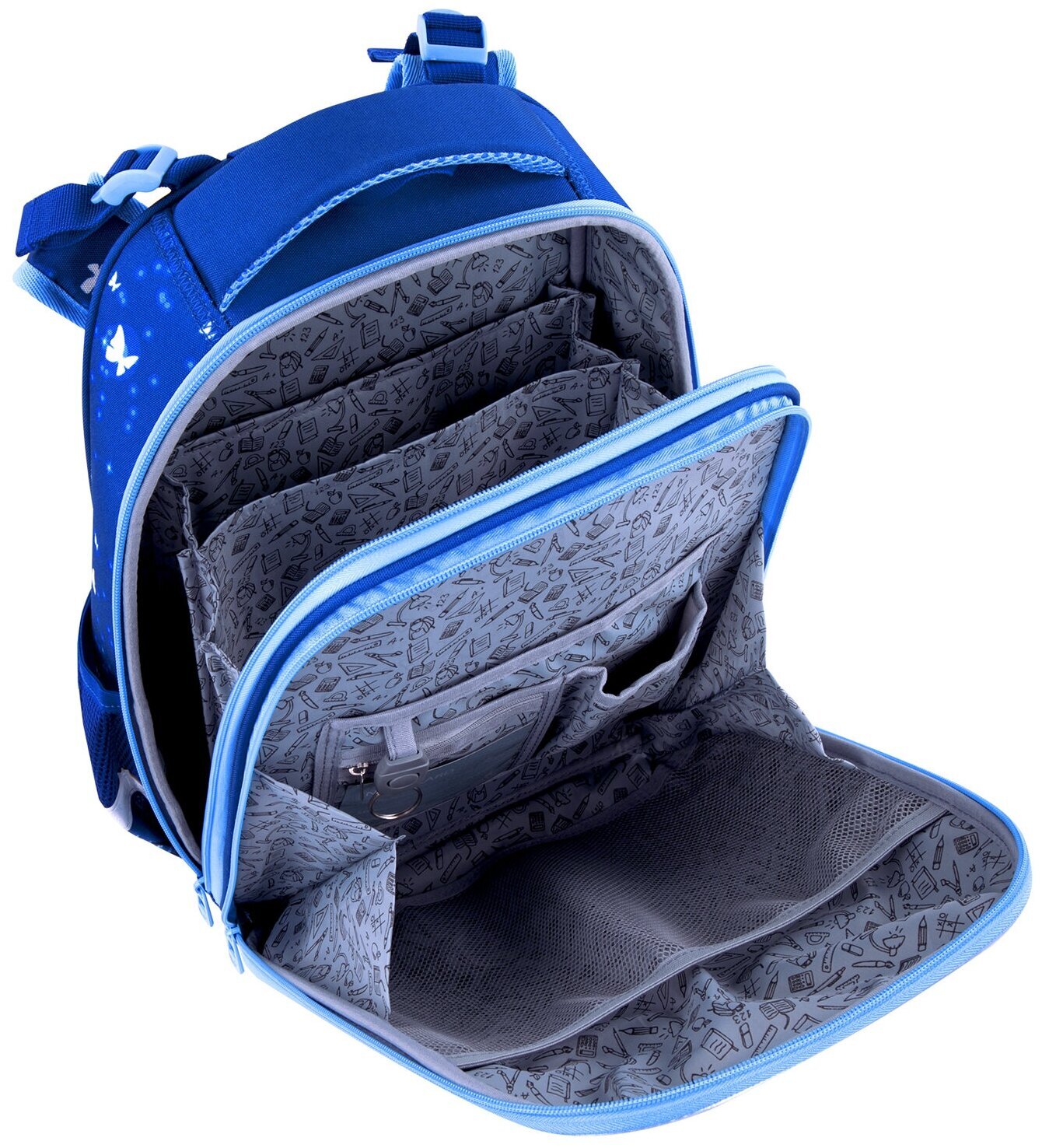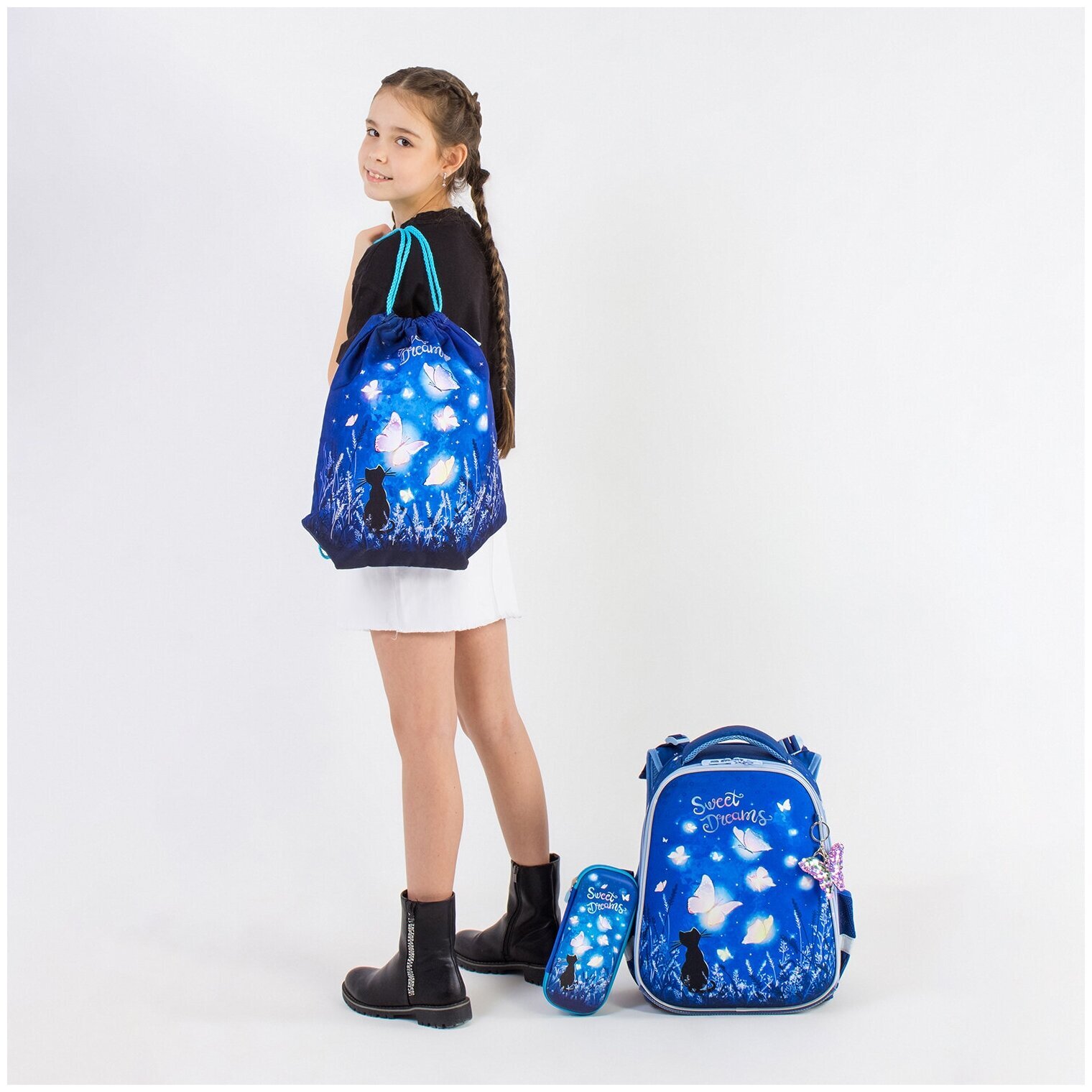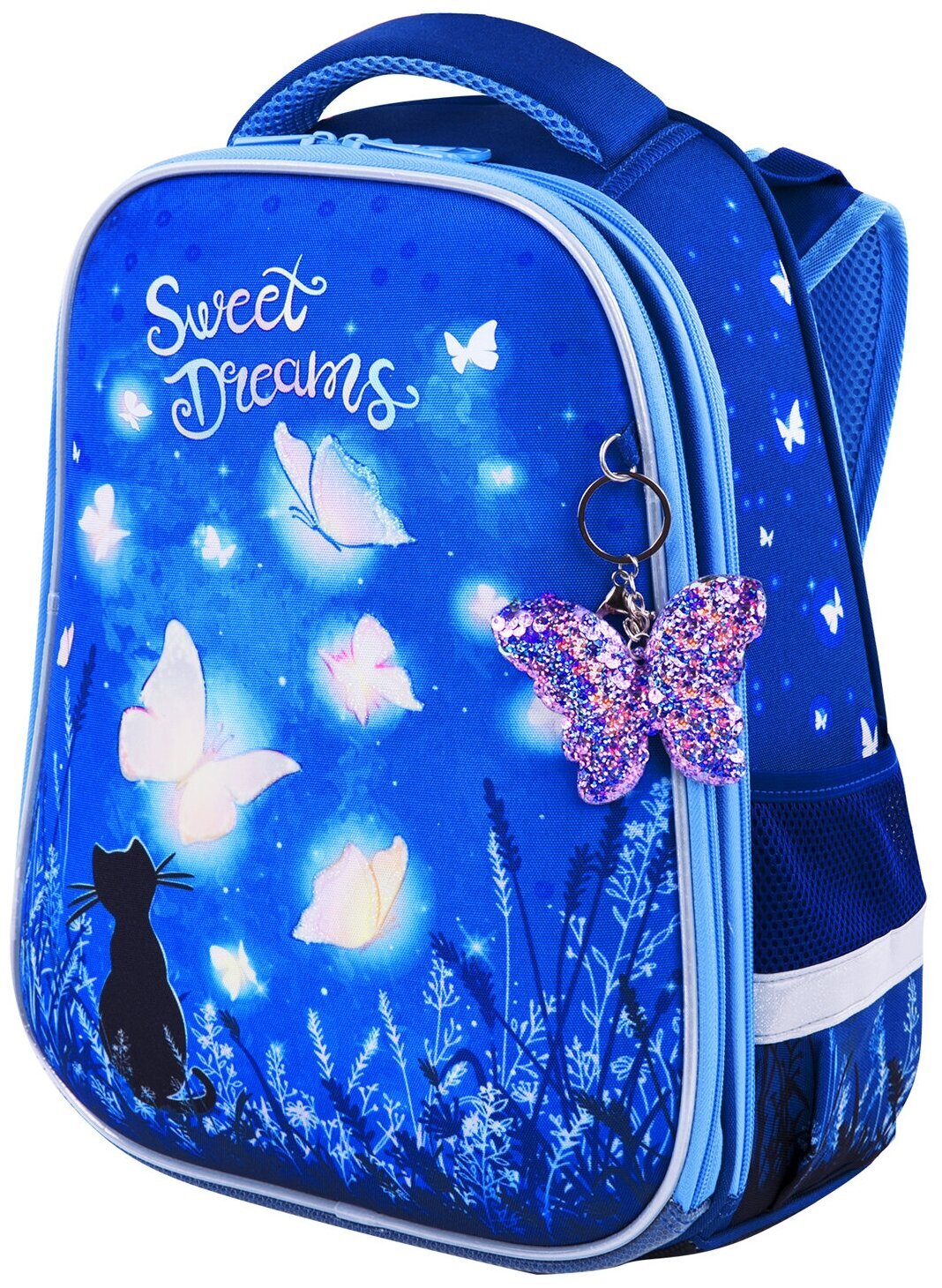 Крылья бабочек на передней панели ранца украшены переливающимися блестками! Светящийся эффект бабочки реализован с помощью современной и технологичной печати на ткани специальной краской. Эффект свечения достигается за счёт накопления дневного или искусственного света.