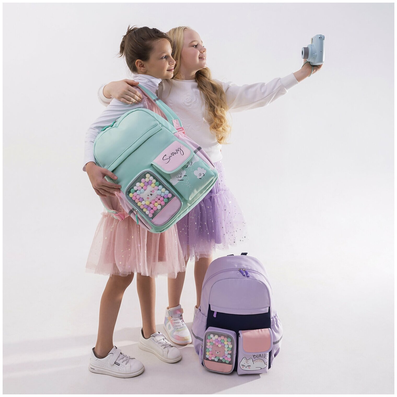 В основном отделении рюкзака можно легко и быстро разместить учебники и тетради формата А4+, а также воспользоваться прижимным разделителем. Спереди рюкзака располагаются три кармана для различных мелочей: прозрачный карман с ярким декоративным наполнением, карман на липучке и большой карман на молни