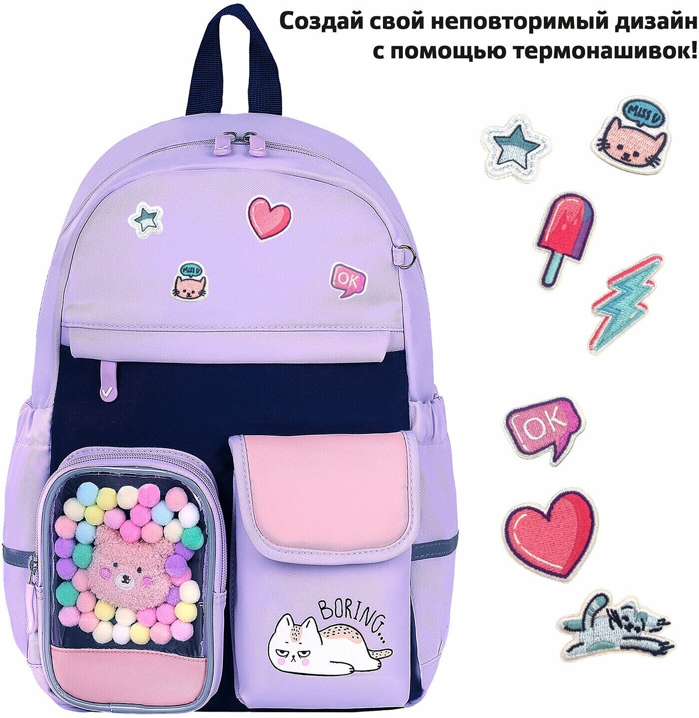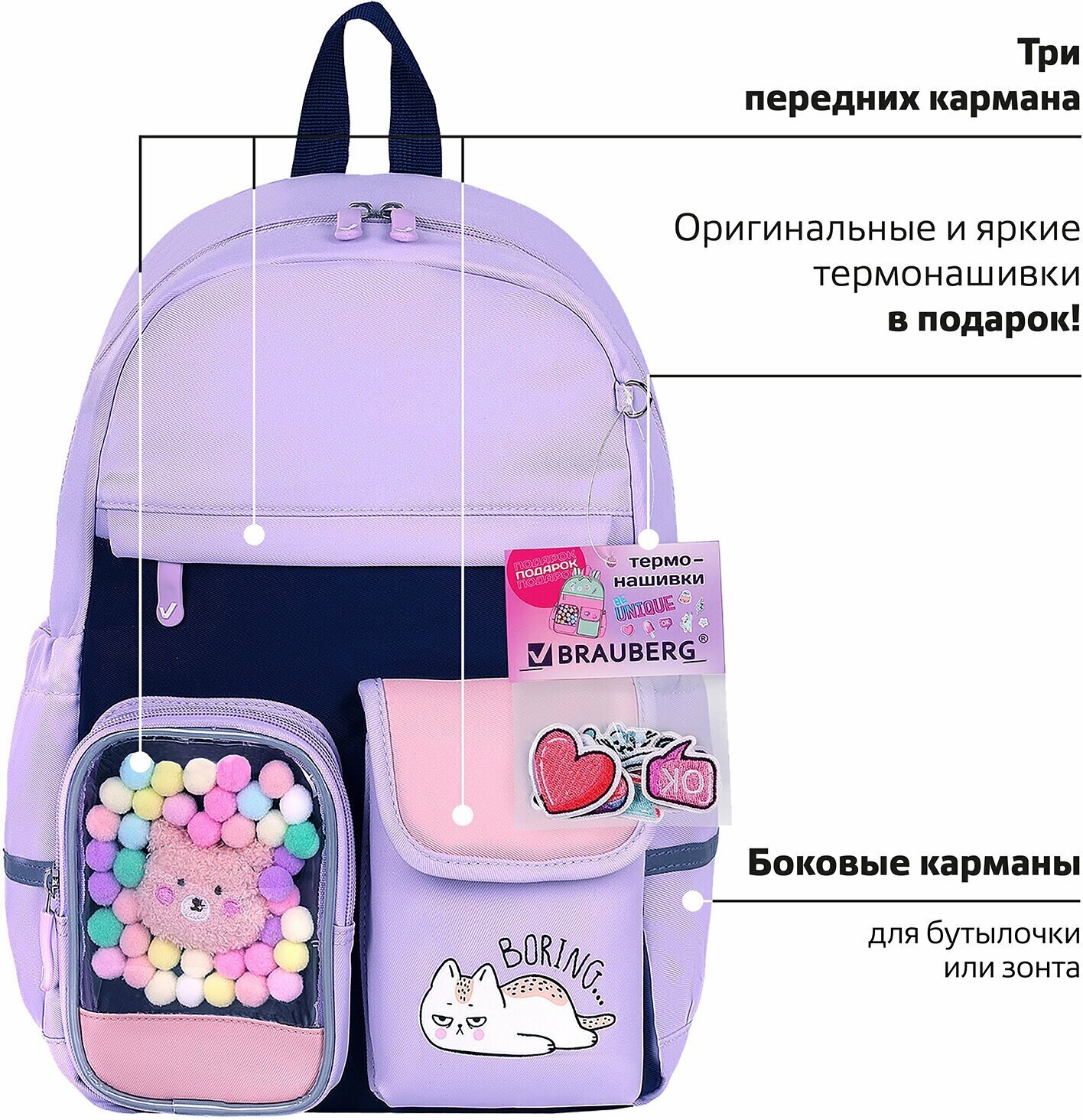 Нежные и воздушные пастельные цвета рюкзаков BRAUBERG PASTEL не оставят равнодушными ни одну юную модницу! Оригинальные и яркие термонашивки делают образ уникальным, а милые плюшевые игрушки в прозрачном кармашке понравятся всем без исключения!Термонашивки в подарок! Возможность создать свой неповторимый дизайн: просто размести термонашивки на рюкзаке и тщательно прогладь утюгом в режиме с паром. За несколько минут можно создать уникальный образ!