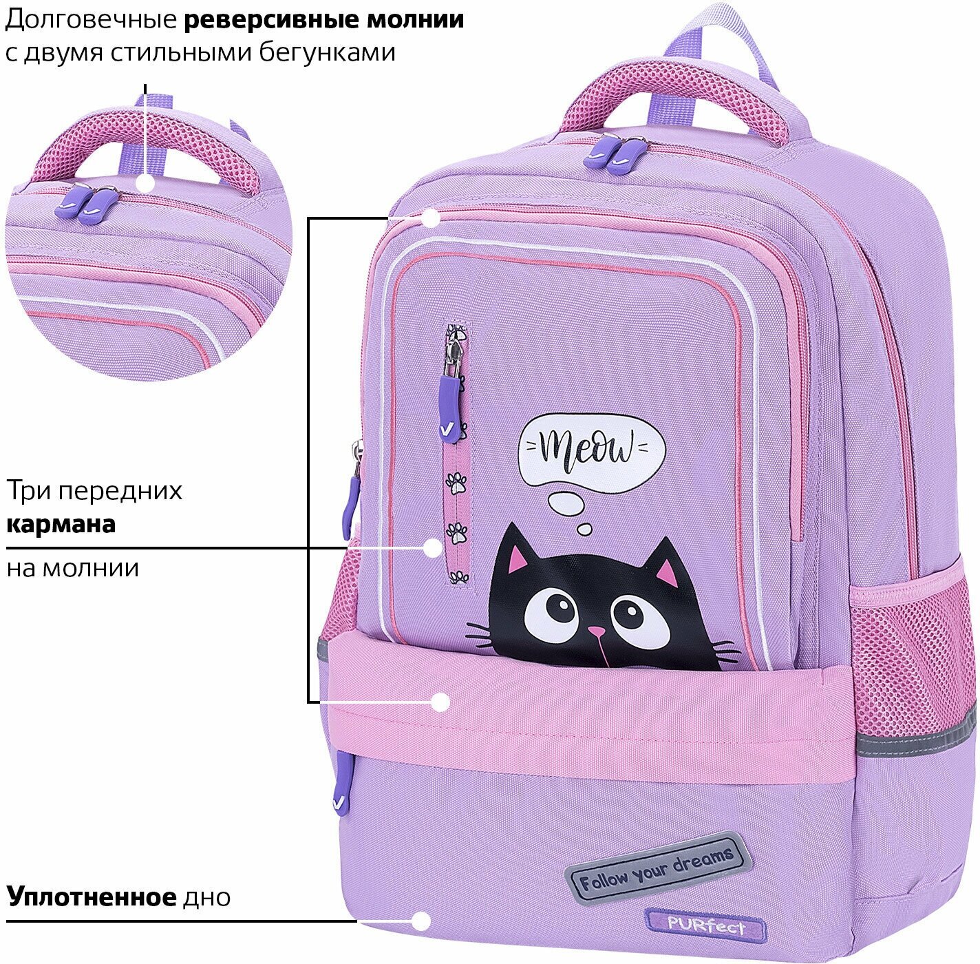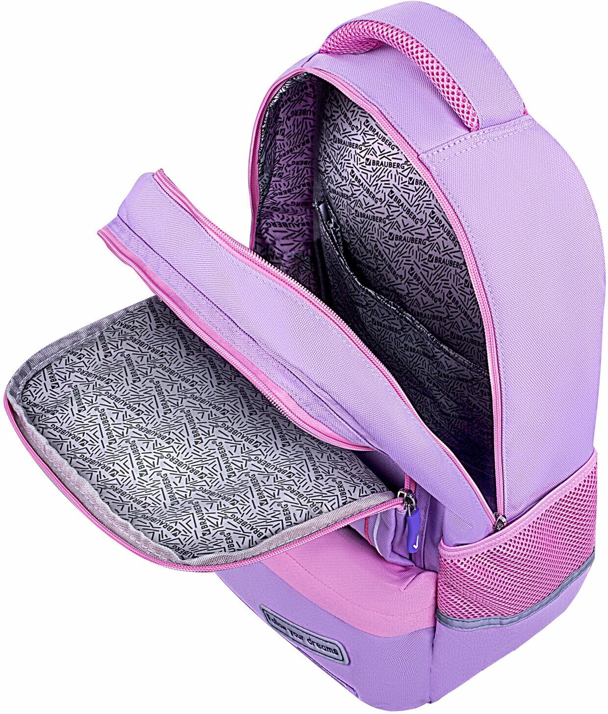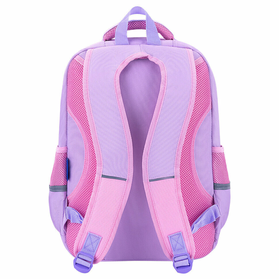 В основном отделении рюкзака можно легко и быстро разместить учебники и тетради формата А4+, а также воспользоваться прижимными разделителями. Спереди рюкзака располагаются два больших кармана на молнии, которые вмещают тетради формата А5 и прочие канцелярские принадлежности, и небольшой карман для различных мел