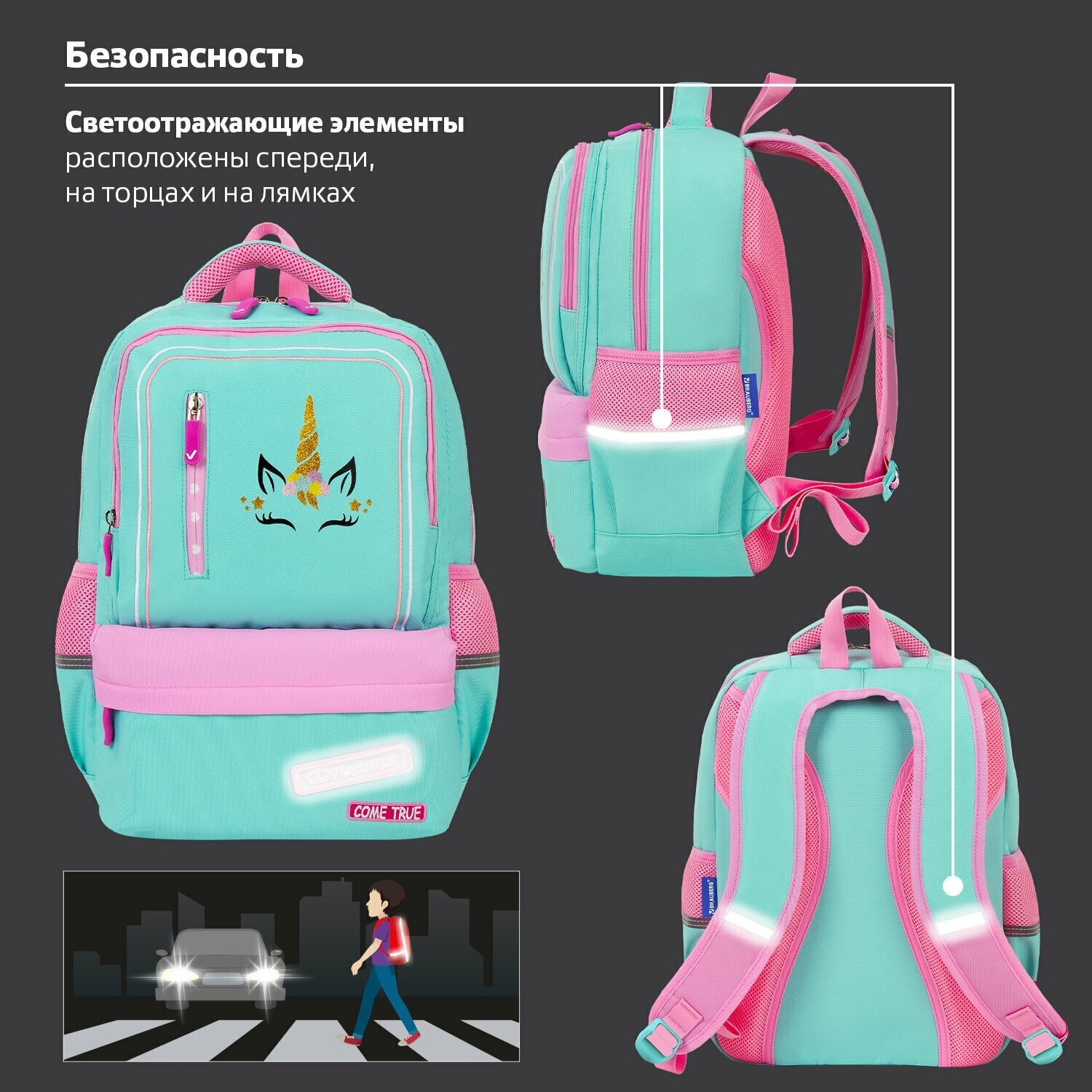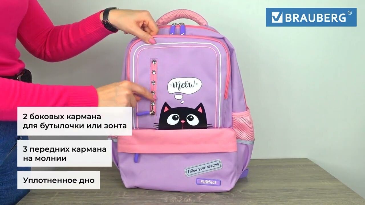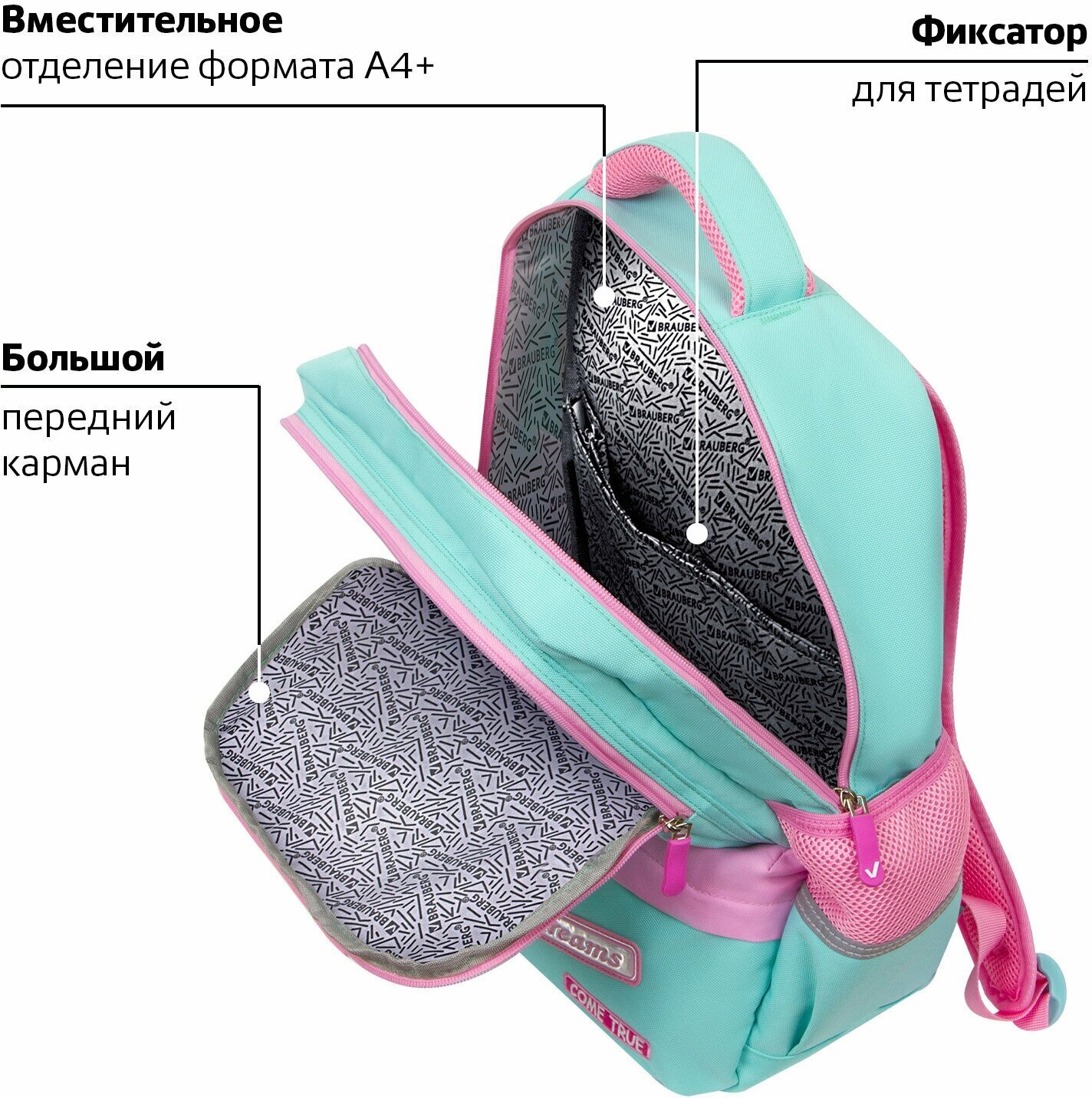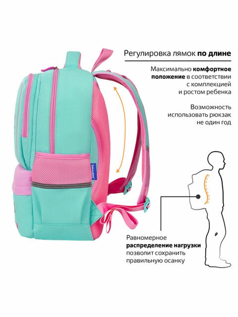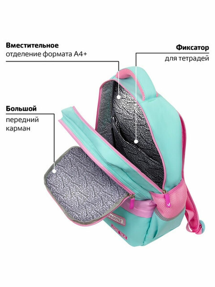 В основном отделении рюкзака можно легко и быстро разместить учебники и тетради формата А4+, а также воспользоваться прижимными разделителями. Спереди рюкзака располагаются два больших кармана на молнии, которые вмещают тетради формата А5 и прочие канцелярские принадлежности, и небольшой карман для различных м