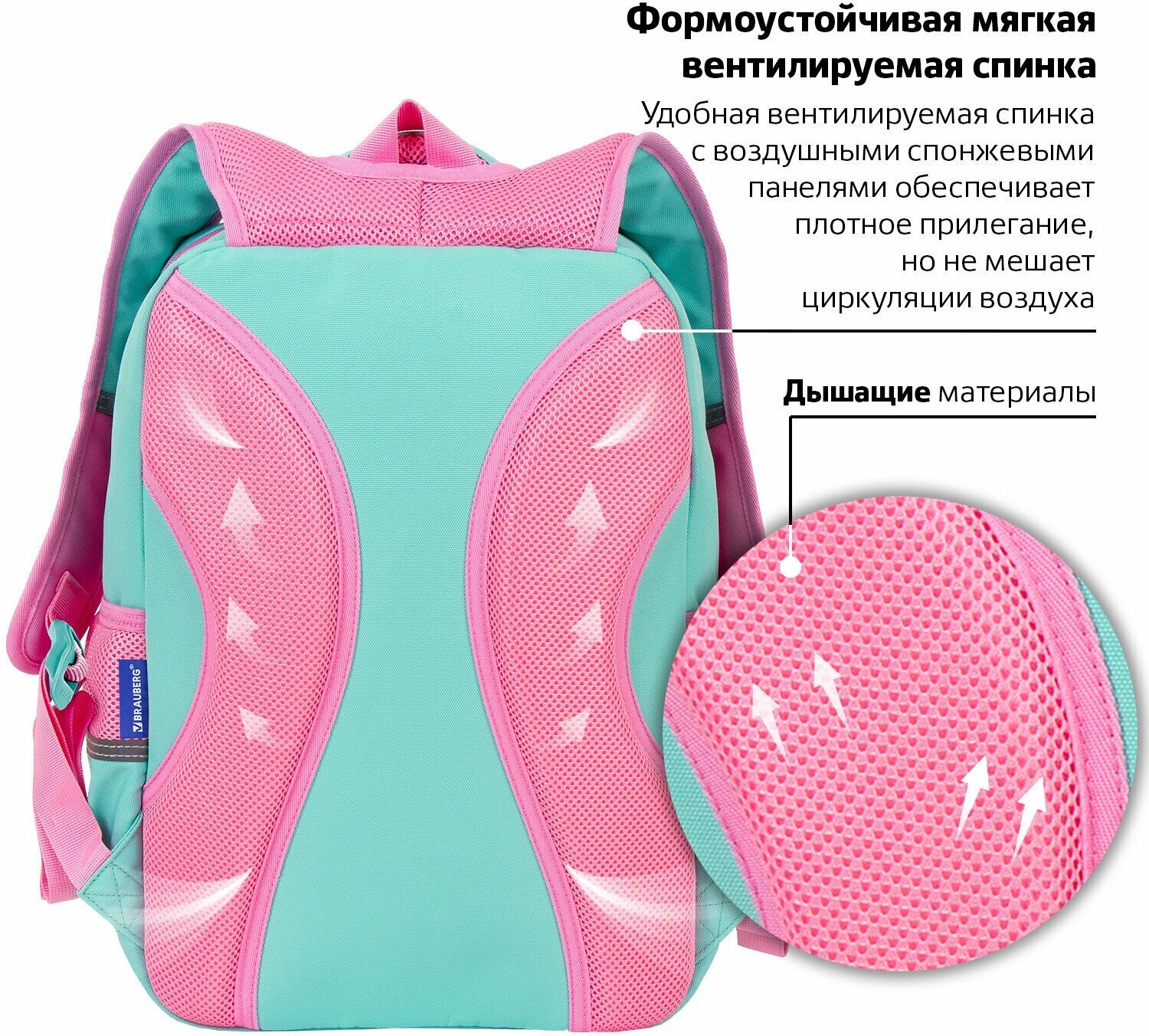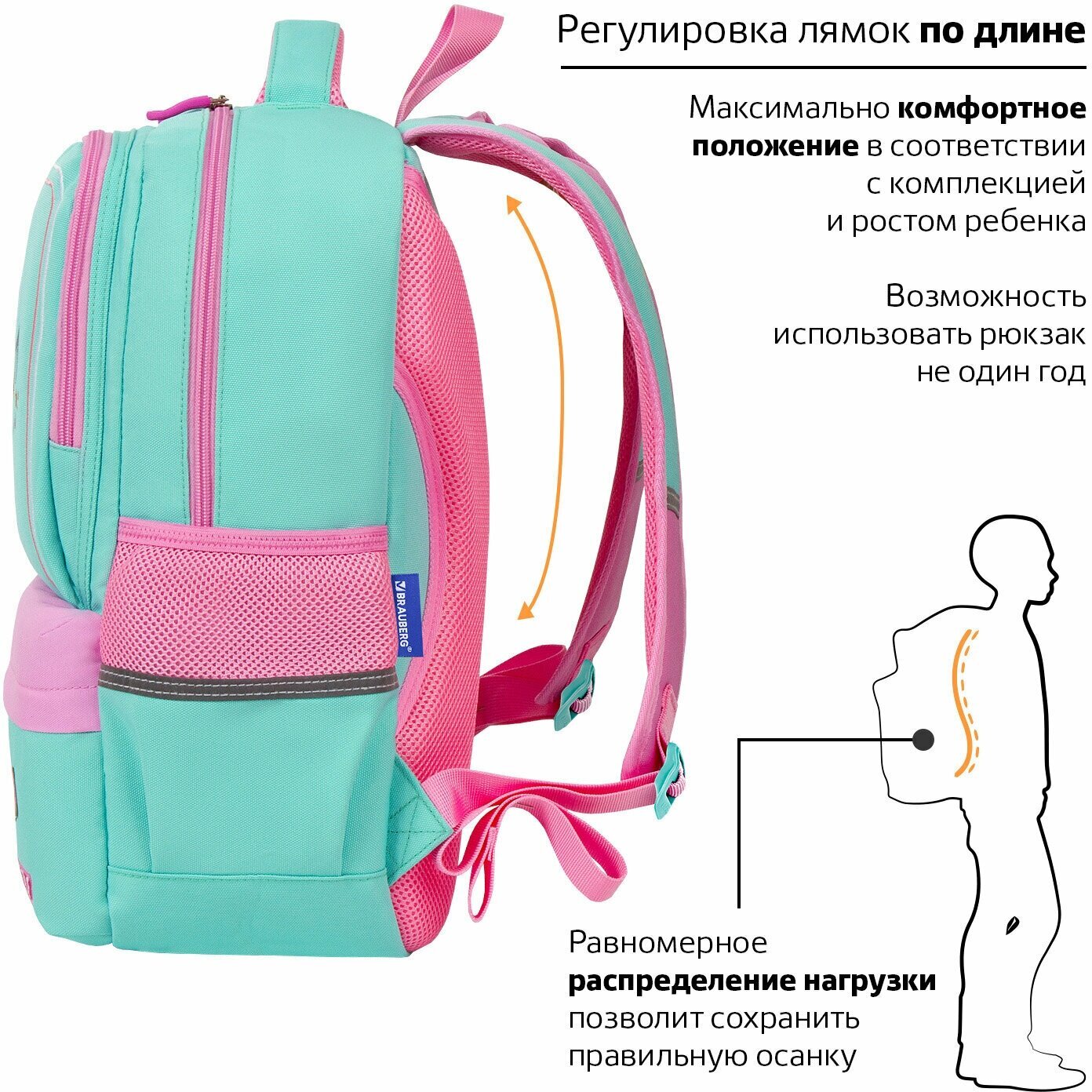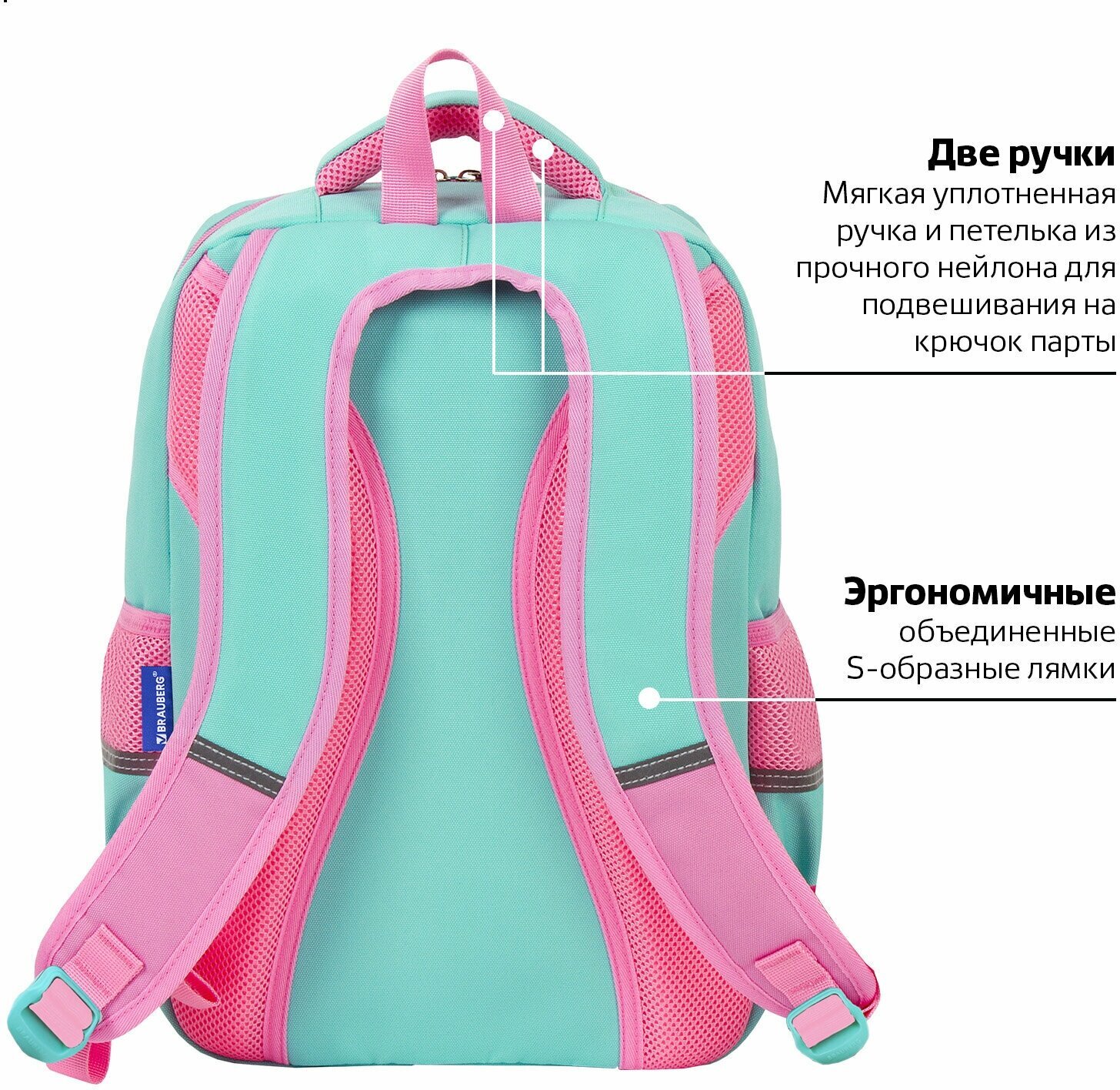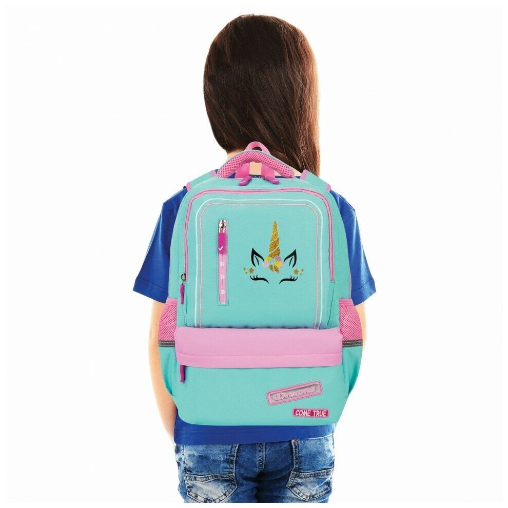 В основном отделении рюкзака можно легко и быстро разместить учебники и тетради формата А4+, а также воспользоваться прижимными разделителями. Спереди рюкзака располагаются два больших кармана на молнии, которые вмещают тетради формата А5 и прочие канцелярские принадлежности, и небольшой карман для различных м