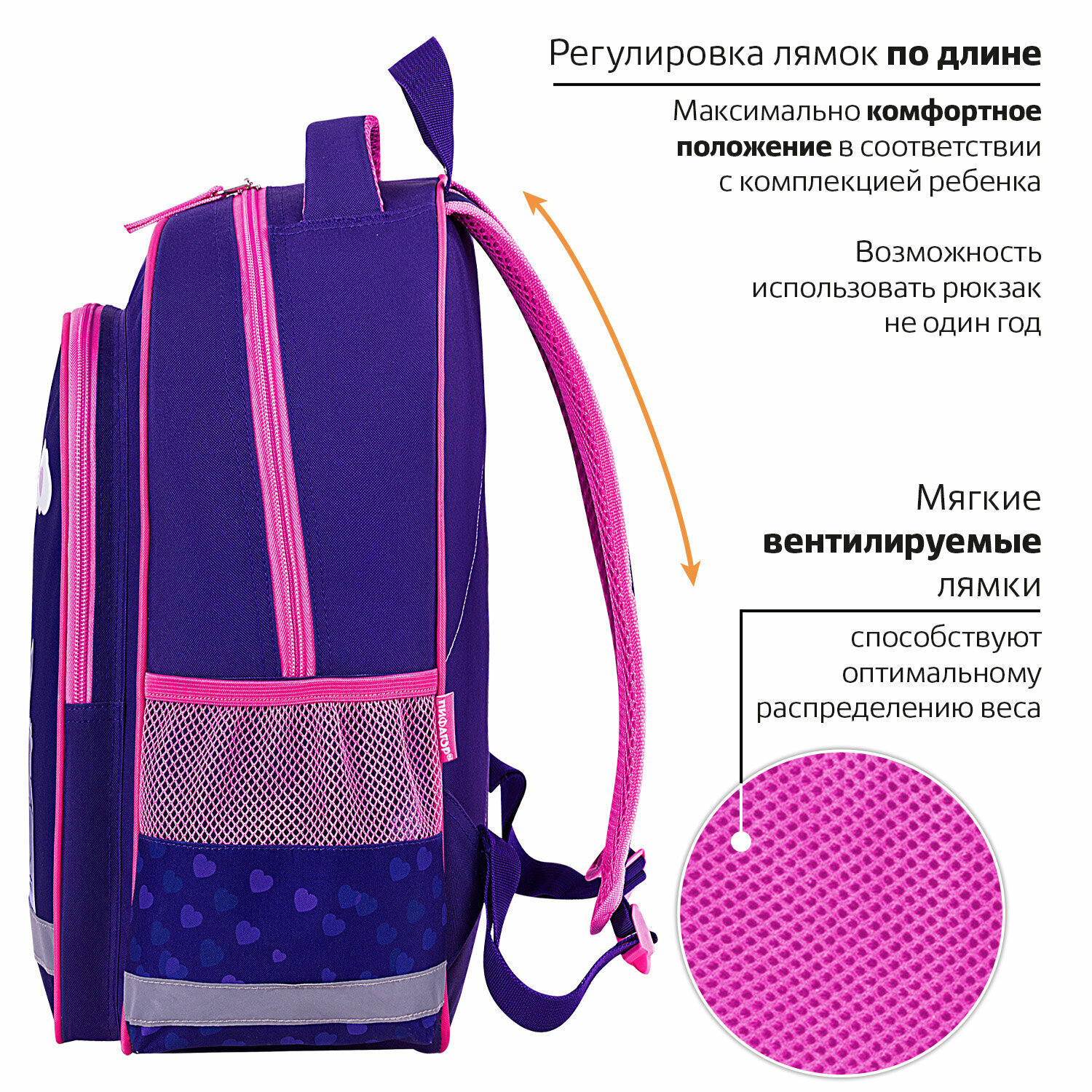 Рюкзак ПИФАГОР серии SCHOOL – оптимальное качество по лучшей цене. Предназначен для учениц начальной школы, выполнен из прочного полиэстера. Уплотненная спинка и лямки с внутренней поверхностью из воздушного спонжа обеспечат комфорт при носке.Рюкзак имеет 1 вместительное отделение на молнии, 1 передний карман и 2 боковых. Оптимальный размер рюкзака позволяет вместить все необходимые школьные принадлежности. Мягкие широкие регулируемые лямки способствуют оптимальному распределению веса.