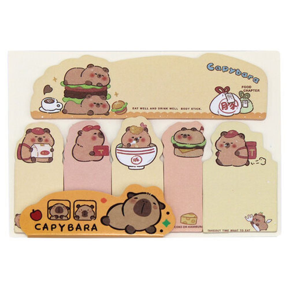Клейкие бумажные закладки "Капибара" с печатью. Оригинальный формат привлечет внимание, заметно преобразив рабочее пространство. Бумажные стикеры удобны для маркировки абсолютно любой поверхности.Бумага с легкостью отделяется от блока, при удалении с поверхности не оставляет следов клея, благодаря чему подходит для многократного переклеивания. Бумажная поверхность позволяет использовать их для краткой записи. Для нанесения информации подойдут любые пишущие принадлежности. В наборе 6 блоков, различных по размеру и дизайну. В каждом блоке 15 листов. Размер – 105х80 мм.